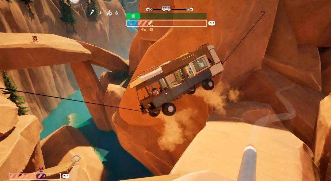 但《我们到了吗?》变得魔性的关键,还是游戏基于物理系统所创造的额外乐趣。近些年已经有无数产品尝试了这一思路,只是《我们到了吗?》的乐趣更新颖也更超常,首先玩家们驾驶的车辆仿佛是个拼接的玩具,不能说一碰就碎,但也扛不住几下磕磕碰碰,这就需要玩家在整个过程中尤为小心,否则一点磕碰它就散架了;其次,为了让车能够回去,大家也自然是在手忙脚乱中苦一苦自己,哪怕是各种折腾,各种当牛马使唤,也是在众人相互配合+搞耍之间完成的。