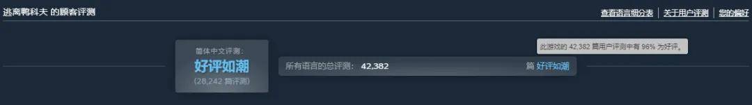 且该作销量口碑双丰收,截至目前,《逃离鸭科夫》在超41000条评价中取得了96%的好评。