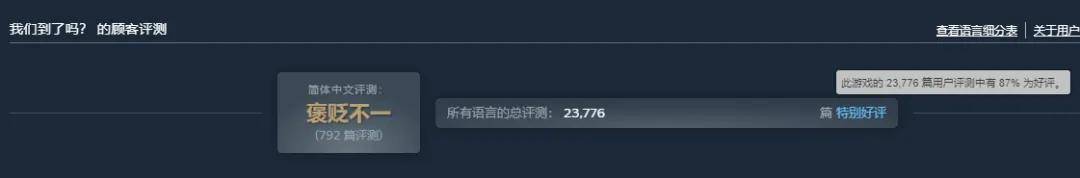 不过比起《逃离鸭科夫》的国内海外两开花,国内游玩《我们到了吗?》的人确实不多,目前Steam上游戏的简中评论数仅有700多条,且只有57%的好评,在全语言超23000条评论,86%的好评中显得有些微不足道。