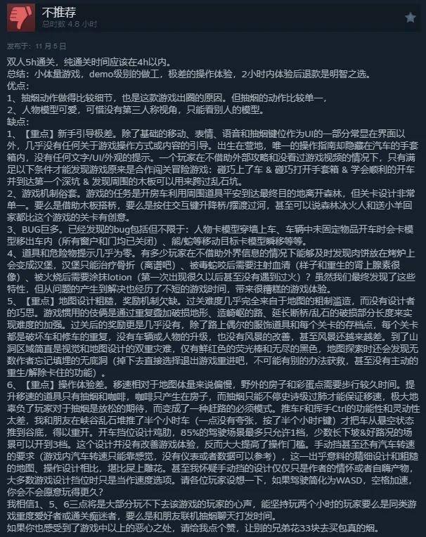 这位玩家还列举了游戏机制俗套、道具和危险物提示几乎为零、地图设计粗糙、操作体验差等问题。