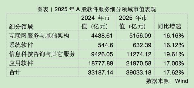 2025年,A股软件服务行业整体呈现出温和但确定的修复行情,行业市值同比增长约18%,总市值从年初的3.32万亿元提升至年末的3.9万亿元。资本市场对软件服务正从“成长焦虑”向“能力重估”转变。
