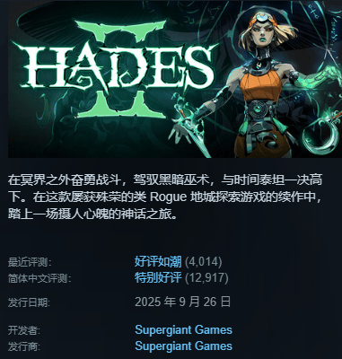 《哈迪斯2》的艺术表现令人屏息,角色引人入胜,战斗快速、有趣、变化无穷且极具战术性,音乐更是精彩绝伦。《哈迪斯2》用20小时主线+小时收集内容,完美继承了前作精髓并带来更深度的战斗演化。