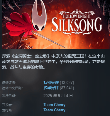 《空洞骑士:丝之歌》自发布以来,评价呈现鲜明两极分化,玩家和媒体的反馈主要围绕其高难度设计、艺术成就与游戏机制争议展开。