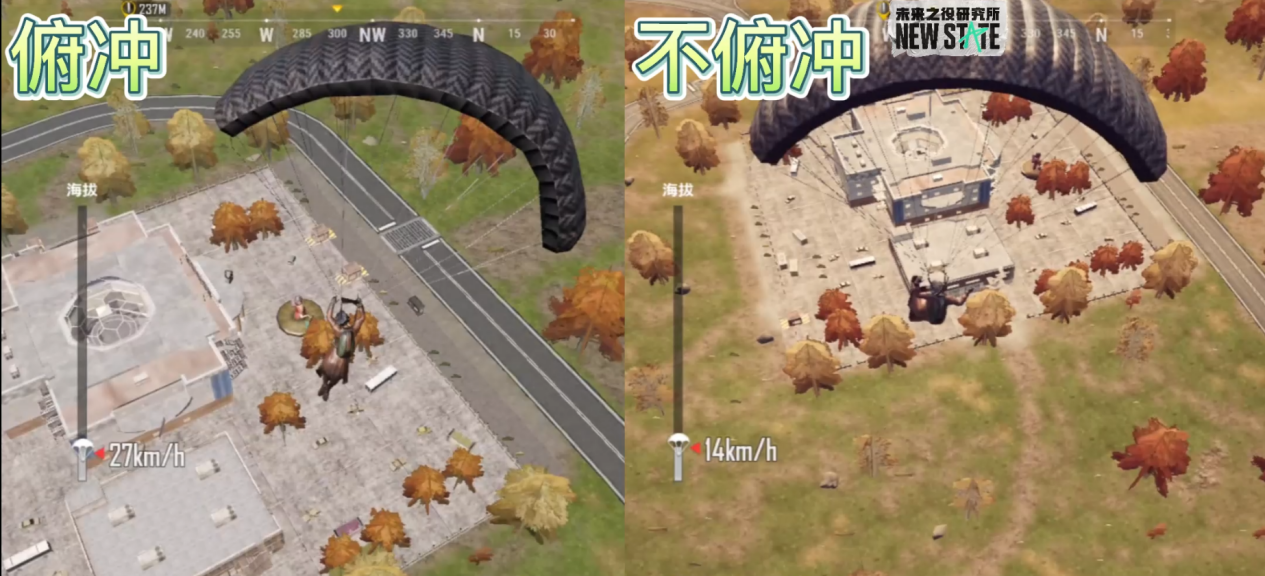 至于为什么要这样做呢?因为开伞之后,会有一段减速的时间,我们开伞前进行俯冲,可以有效的降低开伞后带来的减速效果,为了方便大家观察,这里也做出了一个对比。