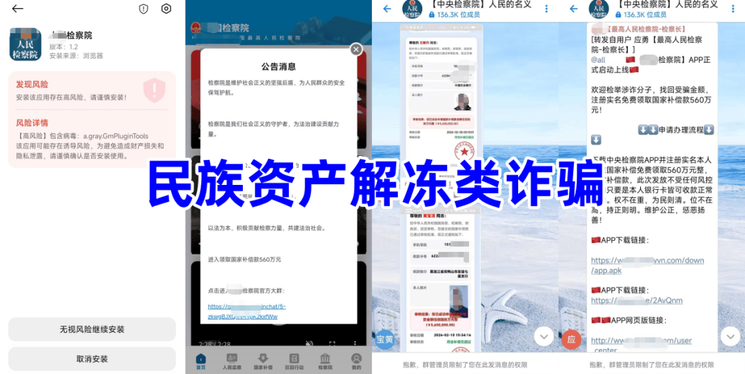 不法分子冒充“检察院”的旗号,声称举报涉诈分子,可找回受骗金额,领取100万现金奖励,参与者实名注册即可领取560万补偿金,发展下线还可以领取补偿金等奖励。