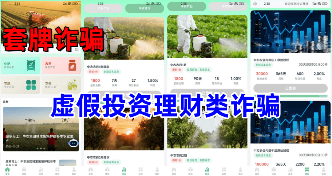 不法分子冒充国企“中国农业生产资料集团有限公司”的名义,打着“乡村振兴”“智慧农业”等旗号,制作散布涉诈APP,虚构推广“中农化肥”“中农农药”“中和农信原始股”等日利率高达2%以上理财项目。