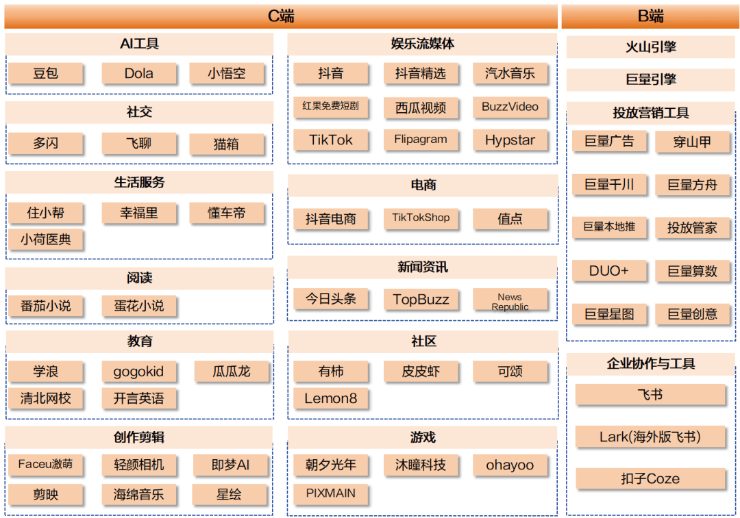 从产业链结构来看,其上游覆盖硬件基础设施与基础软件层,致力于构建自主可控的技术底座;中游包括驱动各平台的推荐算法系统、豆包大模型为代表的AI模型体系,以及抖音、TikTok、飞书等平台产品;下游则延伸至多元化的商业应用与生态整合,包括广告、电商、直播等业务,并向汽车、手机、智能硬件等行业输出解决方案,实现产业赋能。