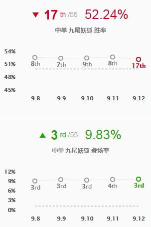 在9.12版本中,有着高爆发、高机动的阿狸再度成为版本强势英雄。目前流行的双冰减速流打法,让她能够很好的带动团队节奏。因为她出众的外表,一直深受玩家们的欢迎。在当前版本她有着高达9.83%的登场率。在胜率方面,虽然比上前几个版本有所下滑,但也以52.24%排在了中单第17的位置,也还是不错的。