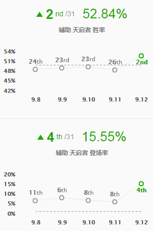 在9.12版本中,卡尔玛得到了加强。Q技能减速效果提高,E技能的蓝耗下降,加速持续时间提升。卡尔玛算是一个比较功能性的英雄,果不其然,在增强后上中辅三个位置中她的胜率都在不断攀升,辅助位胜率更是飙升了24名。